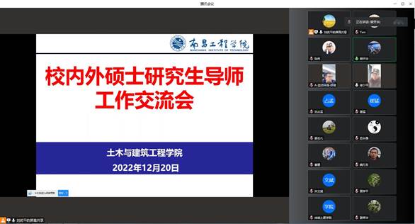 20221220日下午,土木与建筑工程学院校内外研究生导师工作交流会以腾讯会议方式开展。土木与建筑工程学院院长、省级平台主任、学科与研究生培养秘书以及校内外研究生导师参加会议。