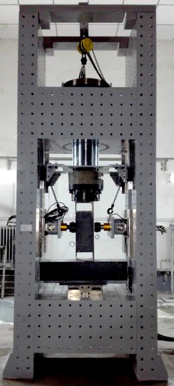 实验装置加载框架、加载单元、测试分析系统以及实验辅助部分组成,可进行双向拉压力及压缩加载。加载架采用双立柱门式框架结构,立柱采用槽型结构,上下横梁采用箱型结构,立柱通长均布安装孔,上下横梁可沿立柱在高度方向按模数任意移动。油缸内置在上横梁内部,拉压力传感器安装在油缸前端,油缸内置位移传感器。油缸活塞及测力单元均需在承受压力的同时能承受相应的弯矩。